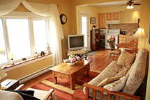 This fine old building, originally made up of rough plank and oversized black spruce beams, has undergone a renovation/rebuild in 2008-2009. The work restored some of its original charm, while lending to it a bit different look with the addition of a Cape style roof to add more headroom in the upstairs bedrooms. It was our goal to maintain that Acadian charm, while updating it to suit the needs of our visitors with a modern bathroom and kitchen.